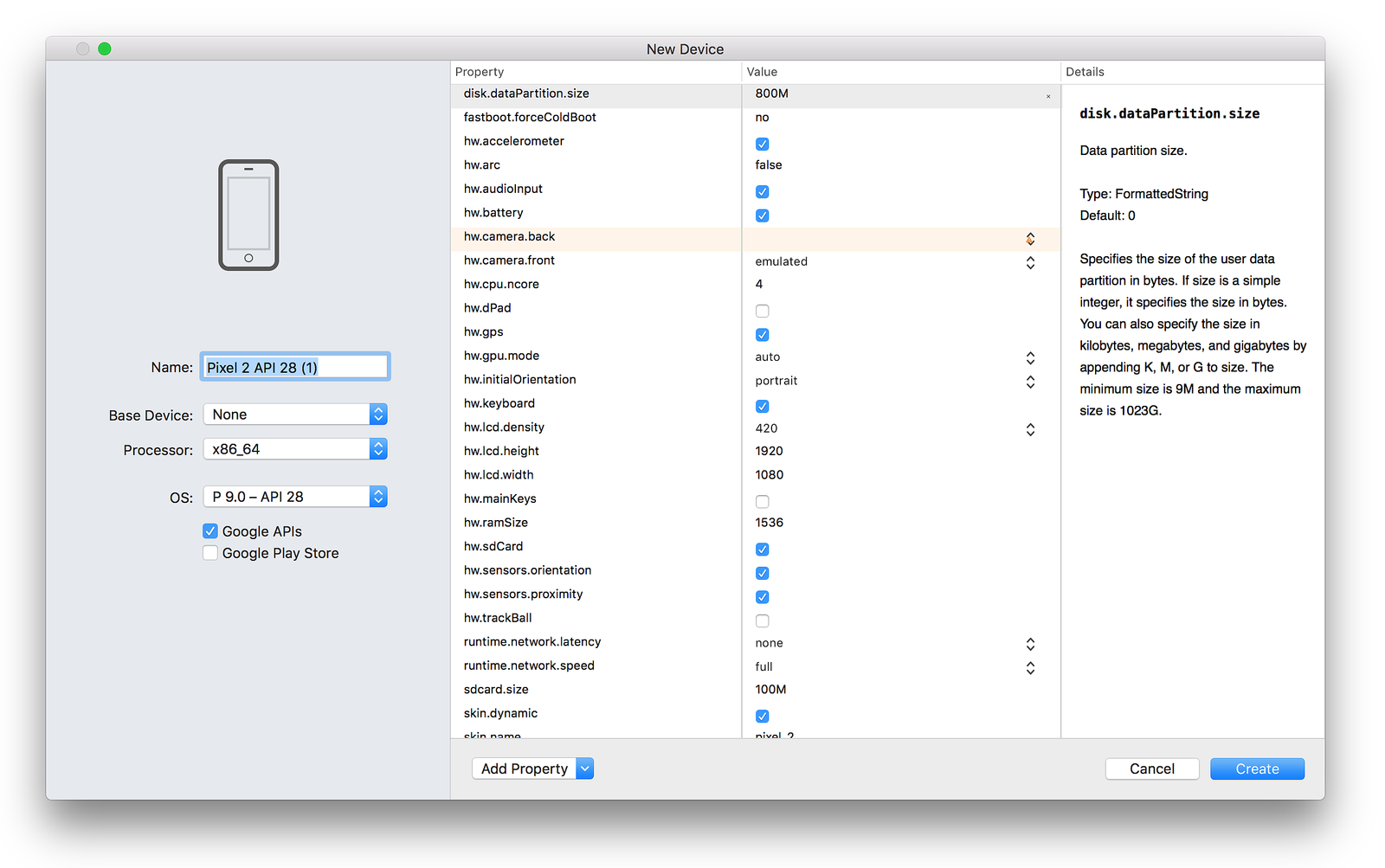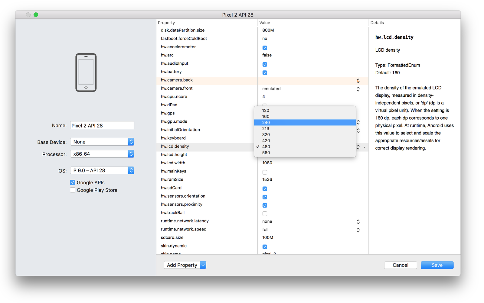 例如,在下面的屏幕截图中,hw.lcd.density 属性正从“480”更改为“240”: