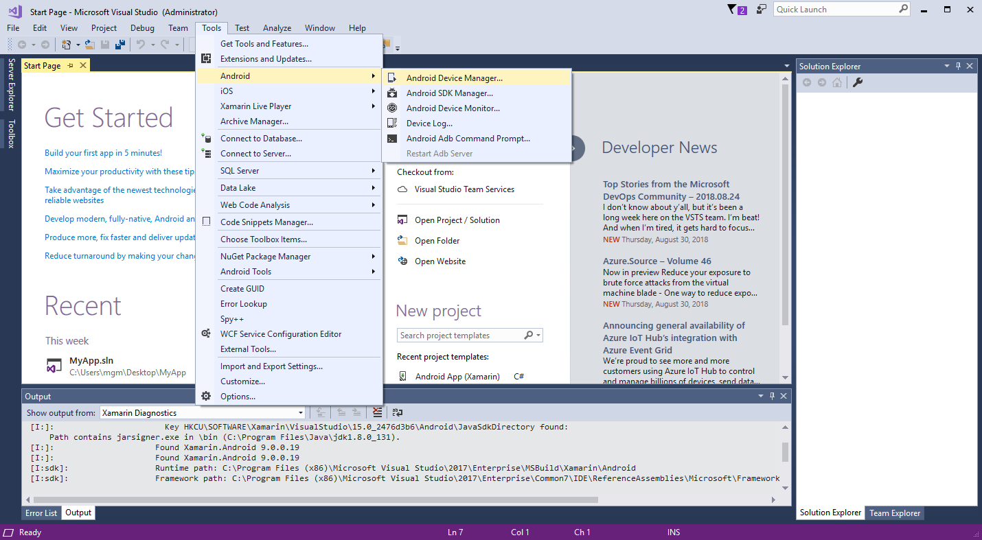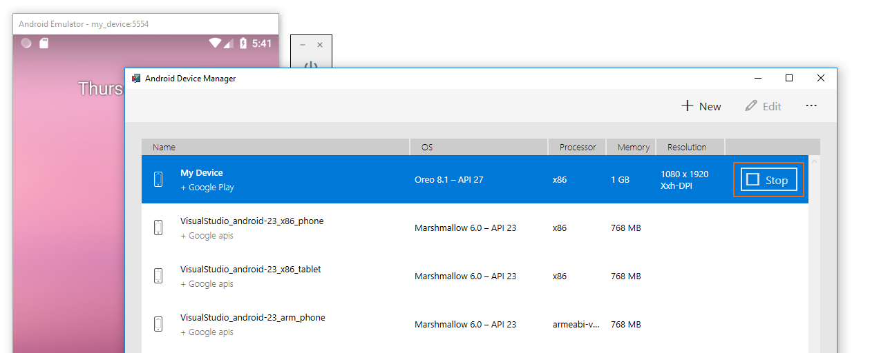 本指南介绍 Visual Studio Tools for Xamarin 和 Visual Studio for Mac 中提供的 Android Device Manager。 其中介绍了启动和停止 Android 仿真器、选择要运行的 Android 虚拟设备 (AVD)、创建新的虚拟设备以及如何编辑虚拟设备等基本功能。 还介绍了如何编辑配置文件硬件属性以便进一步进行自定义并提供了常见问题的故障排除技巧。