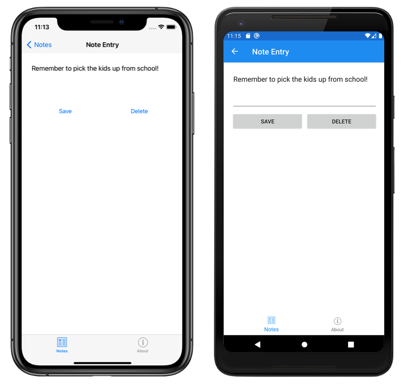LoadNote、OnSaveButtonClicked和OnDeleteButtonClicked替换为以下代码:async void LoadNote(string itemId) { try { int id = Convert.ToInt32(itemId); // Retrieve the note and set it as the BindingContext of the page. Note note = await App.Database.GetNoteAsync(id); BindingContext = note; } catch (Exception) { Console.WriteLine("Failed to load note."); } } async void OnSaveButtonClicked(object sender, EventArgs e) { var note = (Note)BindingContext; note.Date = DateTime.UtcNow; if (!string.IsNullOrWhiteSpace(note.Text)) { await App.Database.SaveNoteAsync(note); } // Navigate backwards await Shell.Current.GoToAsync(".."); } async void OnDeleteButtonClicked(object sender, EventArgs e) { var note = (Note)BindingContext; await App.Database.DeleteNoteAsync(note); // Navigate backwards await Shell.Current.GoToAsync(".."); }NoteEntryPage使用LoadNote方法从数据库中检索注释(其 ID 已作为查询参数传递到页面),并将其存储为页面的BindingContext中的Note对象。 执行OnSaveButtonClicked事件处理程序时,Note实例会保存到数据库中,并且应用程序会导航回上一页。 执行OnDeleteButtonClicked事件处理程序时,Note实例会从数据库中删除,并且应用程序会导航回上一页。通过选择“文件”>“保存”(或按 ⌘ + S),保存对 NoteEntryPage.xaml.cs 所做的更改。