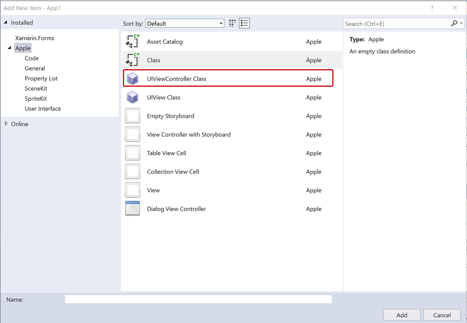 我们需要做的第一件事是为自定义视图创建类。 我们将如下所述完成此工作:使用 Visual Studio 中的“类”模板添加一个名为 CircleView 的空类。 基类应该设置为 UIView,我们记得它在 UIKit 命名空间中。 我们还需要 System.Drawing 命名空间。 此示例中不会使用其他各种 System.* 命名空间,因此可以随意移除它们。