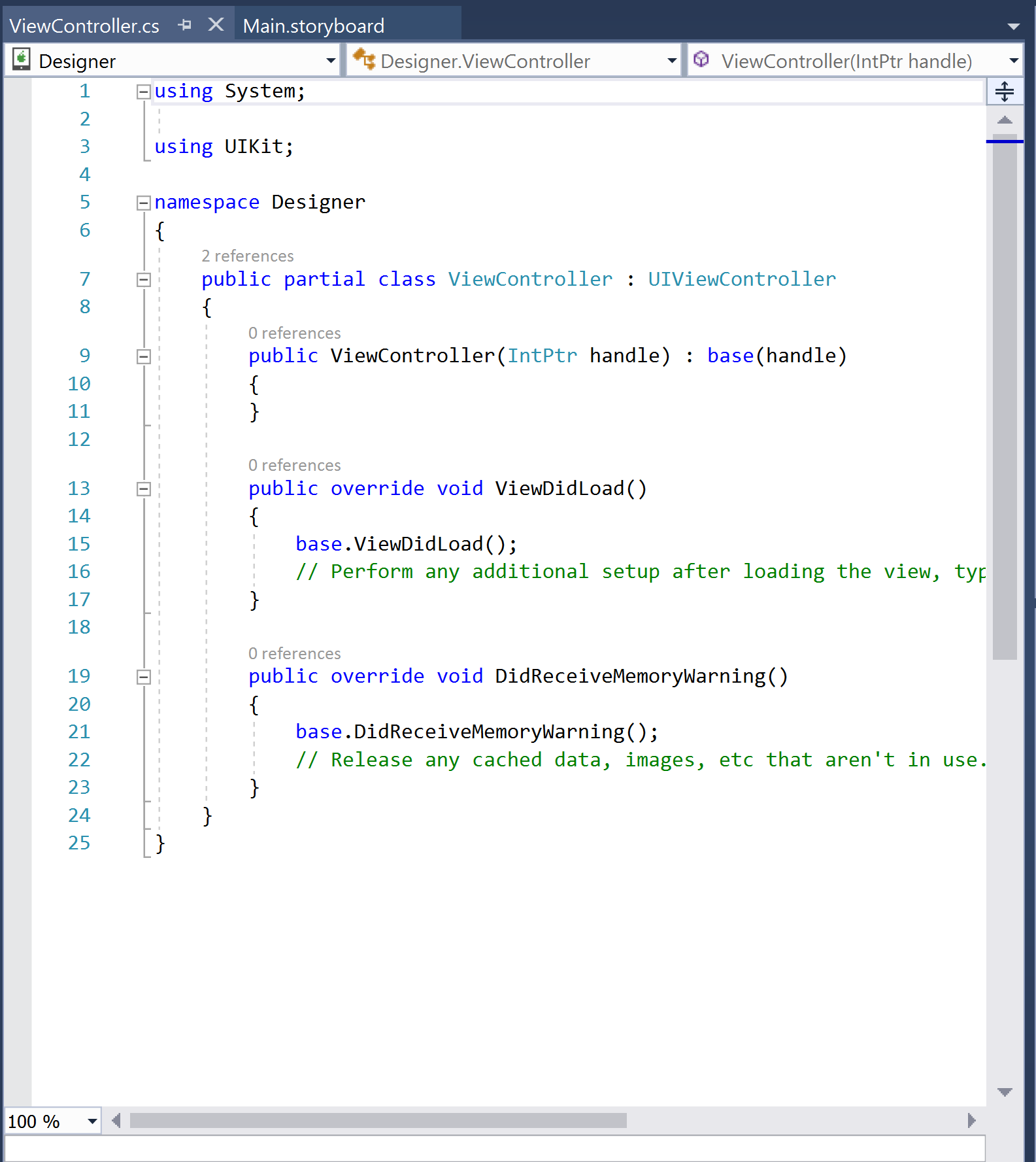ViewController类中的代码可以按“名称”访问 iOS 设计器中设置的控件。 打开 ViewController.designer.cs 会显示以下代码: