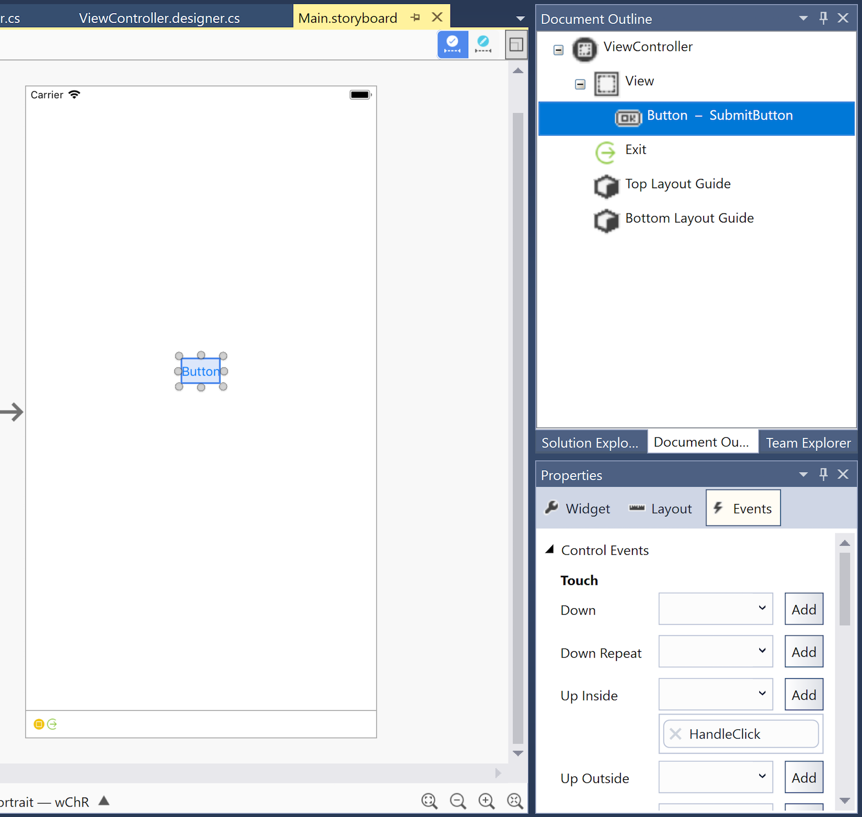 若要为各种事件指定自定义事件处理程序,请使用“Properties Pad”的“事件”选项卡。 例如,在以下屏幕截图中,HandleClick 方法处理按钮的“Touch Up Inside”事件: