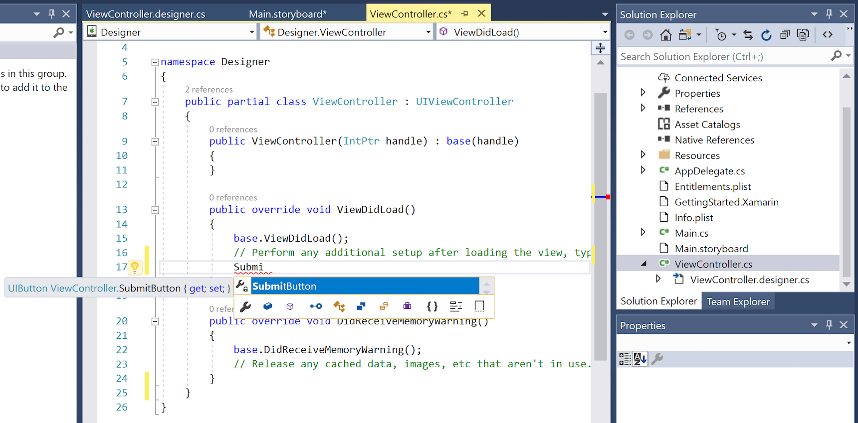 以下屏幕截图演示了 IntelliSense 现在可以识别 ViewController.cs 中的 SubmitButton 引用: