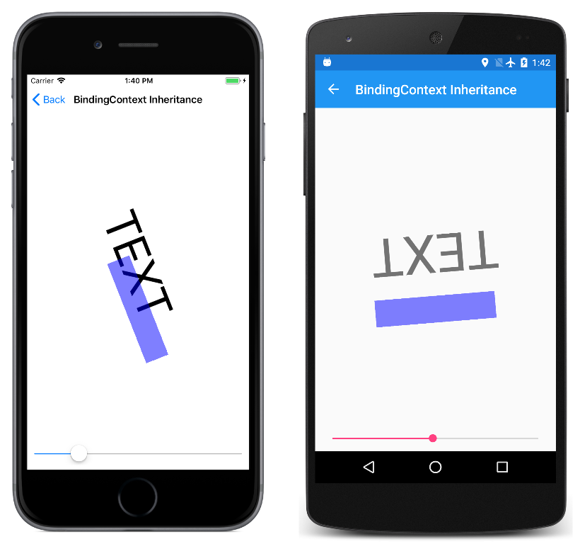 StackLayout 的 BindingContext 属性设置为 slider 对象。 该绑定上下文由 Label 和 BoxView 继承,它们的 Rotation 属性都设置为 Slider 的 Value 属性: