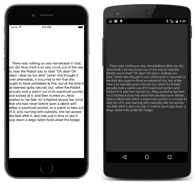 如果 Label 受约束,它可能会占用比文本呈现所需大得多的空间。 可以在 Label 的整个区域内定位文本。 将 HorizontalTextAlignment 属性设置为 TextAlignment 枚举的成员(Start、Center 或 End),可以控制段落中所有行的对齐方式。 默认值为 Start,即左对齐文本。
