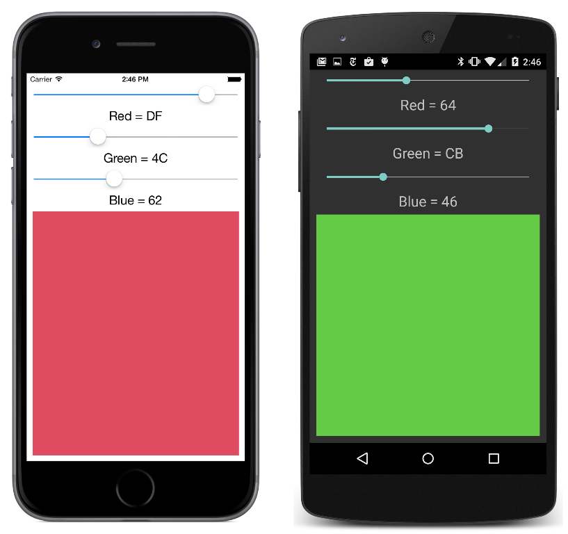 RgbSliders 程序包含三个 Slider 元素,可便于通过指定 RGB 值以交互方式选择颜色: