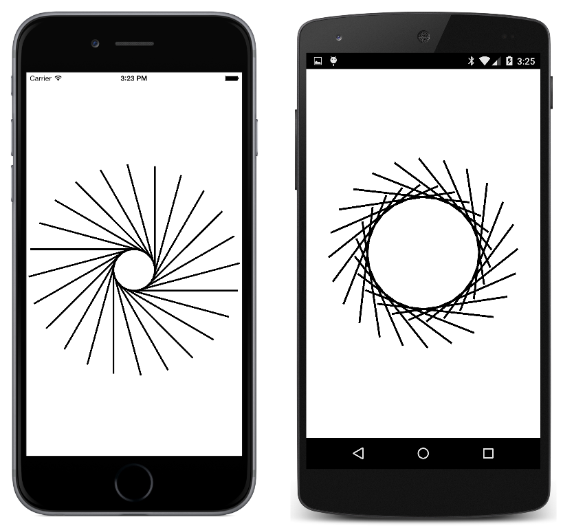 RotatingSpokes 使 BoxView 轮辐围绕屏幕中心旋转,然后旋转每个轮辐本身以创建有趣的图案: