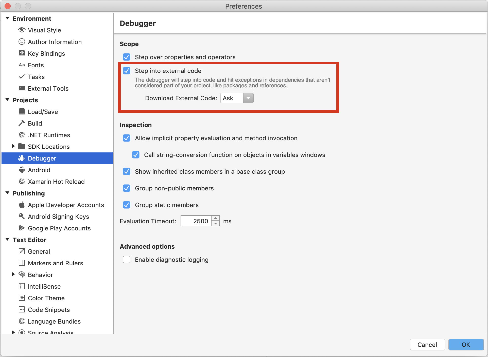 使用源链接需要为外部代码启用调试,否则调试程序将跳过对当前解决方案中未包含的代码的调用。 在 Visual Studio 2019 中,此功能位于“调试”部分的“选项”菜单下: