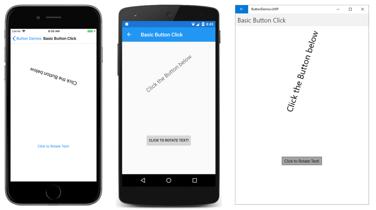 这个特定的 Clicked 处理程序调用一个动画函数,该函数以 360 度旋转 Label 1000 毫秒。 下面是在 iOS 和 Android 设备上运行的程序,它在 Windows 10 桌面上充当通用 Windows 平台 (UWP) 应用程序: