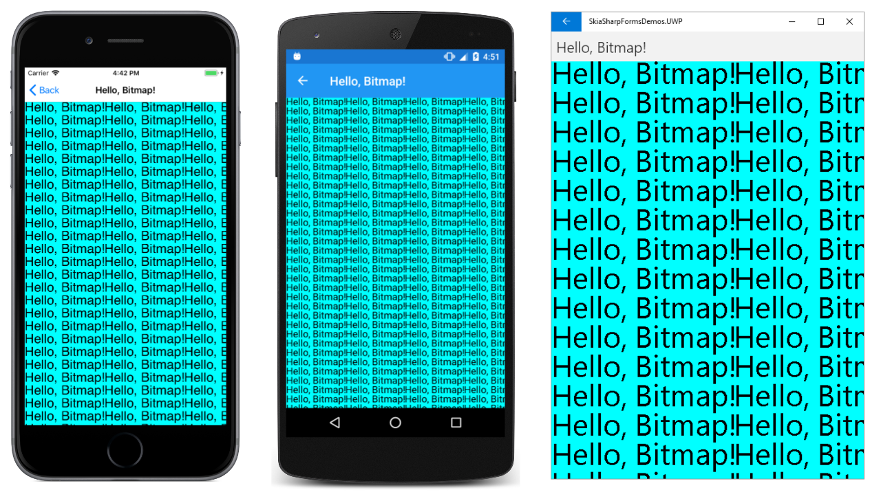 HelloBitmapPage 构造函数首先是创建一个 SKPaint 对象来显示文本。 它确定文本字符串的尺寸,并使用这些维度创建位图。 然后,它基于该位图创建一个 SKCanvas 对象,调用 Clear,然后调用 DrawText。 使用新位图进行调用 Clear 总是一个好主意,因为新创建的位图可能包含随机数据。
