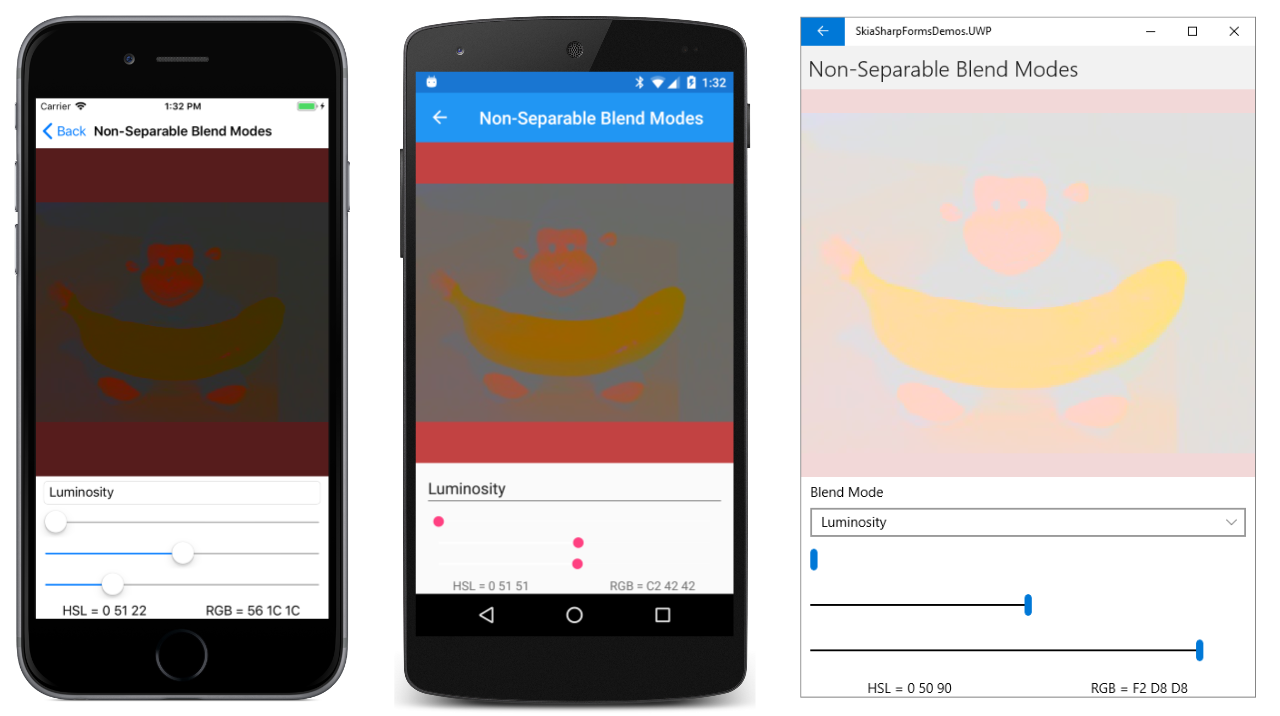 如 SkiaSharp 可分离混合模式一文中所述,可分离混合模式分别对红色、绿色和蓝色通道执行操作。 不可分离混合模式则不然。 通过对颜色的色调、饱和度和亮度级别进行操作,不可分离混合模式能够以有趣的方式改变颜色: