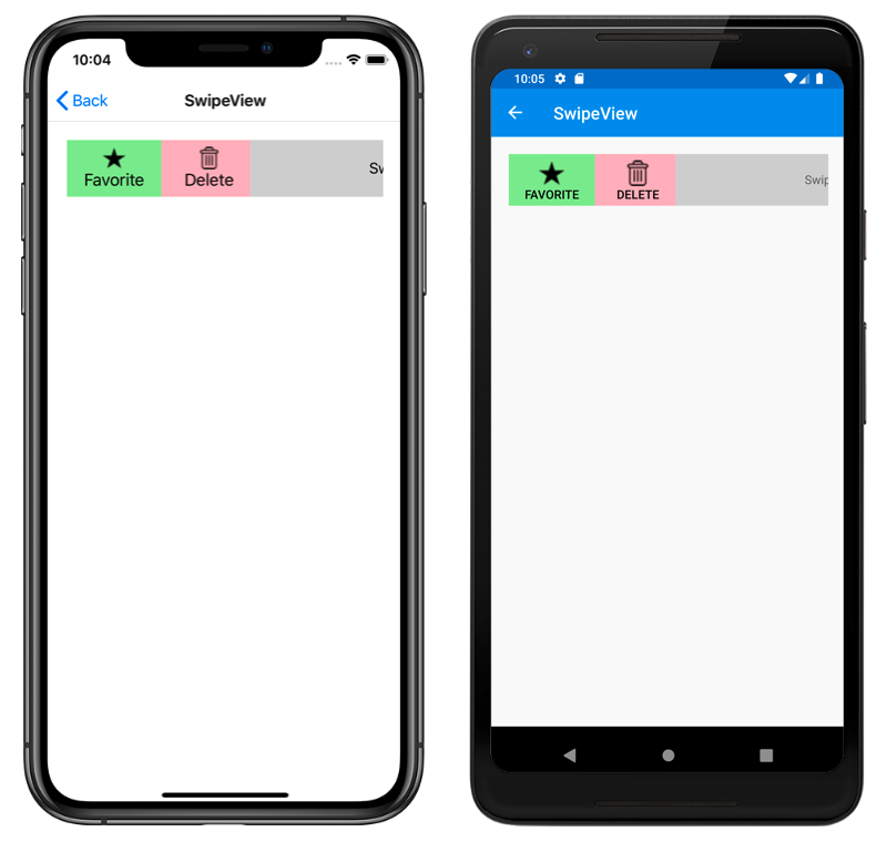 在此示例中,SwipeView 内容可以向右或向左轻扫。 向右轻扫将显示“删除”轻扫项,而向左轻扫将显示“收藏夹”和“共享“共享轻扫项。
