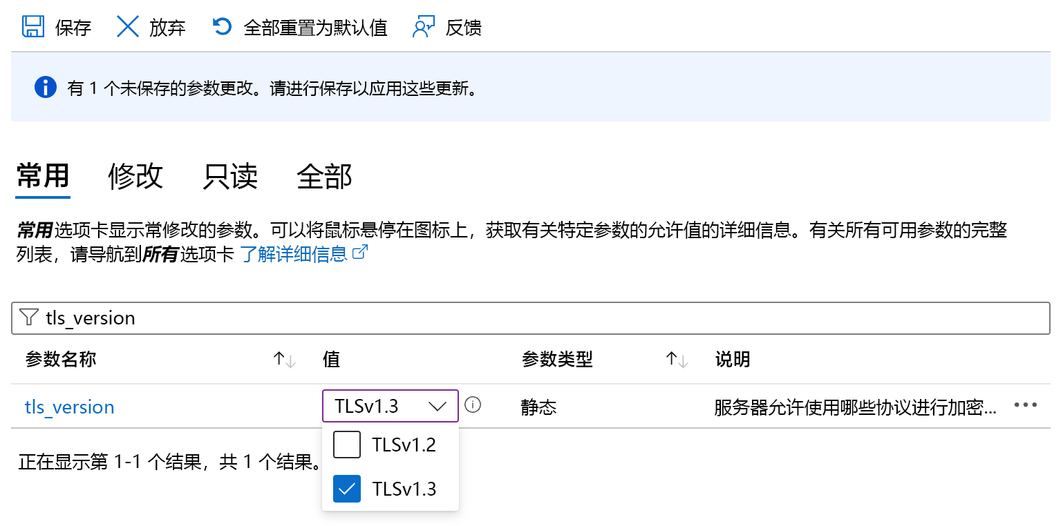 默认情况下,MySQL 灵活服务器仅接受使用 TLS(传输层安全性)版本 1.2 的加密连接。 如果要开发支持 TLS 1.3 的新应用程序,建议支持甚至强制使用更高的版本。 为此,请执行以下步骤: