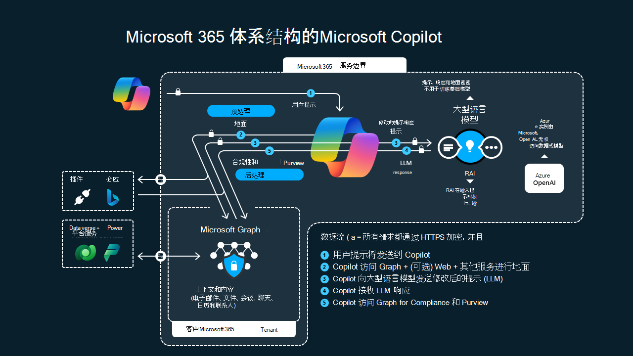 - 然后,Copilot 通过一种称为“接地”的方法预处理输入提示。 地面改进了提示的特定性,从而帮助你获得与特定任务相关且可作的答案。 提示可以包括来自输入文件的文本或 Copilot 发现的其他内容,Copilot 会将此提示发送到 LLM 进行处理。 Copilot 仅访问单个用户有权访问的数据,例如,基于现有的 Microsoft 365 基于角色的访问控制。