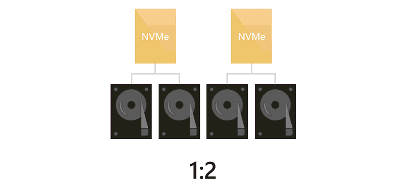当存在所有三种类型的驱动器时,NVMe 驱动器为 SSD 和 HDD 提供缓存。 行为如上所述:仅缓存 SSD 的写入,而 HDD 的读取和写入都将被缓存。 HDD 的缓存负担均匀分布在缓存驱动器之间。